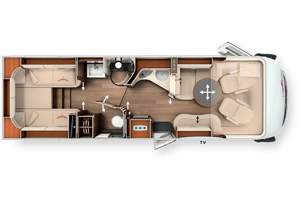 Nuestras autocaravanas compactas tienen unas medidas muy similares a las campers, llegando a los 6,8 metros. Pero cabe destacar que las autocaravanas compactas, a diferencia de las campers, cuentan con un garaje donde poder guardar las bicicletas, los esquís o el material que Ud, desee, guardado a buen recaudo y sin que los demás puedan verlo.