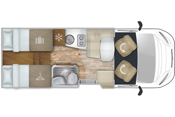Mobiliario en madera clara / Tapicería “Cozy” / Oscurecedores térmicos de cabina / Claraboyas (baño 280×280, central y posterior Mini Heki 400×400) / Transformación dinette en cama / Transformación camas gemelas en cama matrimonial / Cocina 2 fuegos / Cubierta fregadero/tabla de cortar
