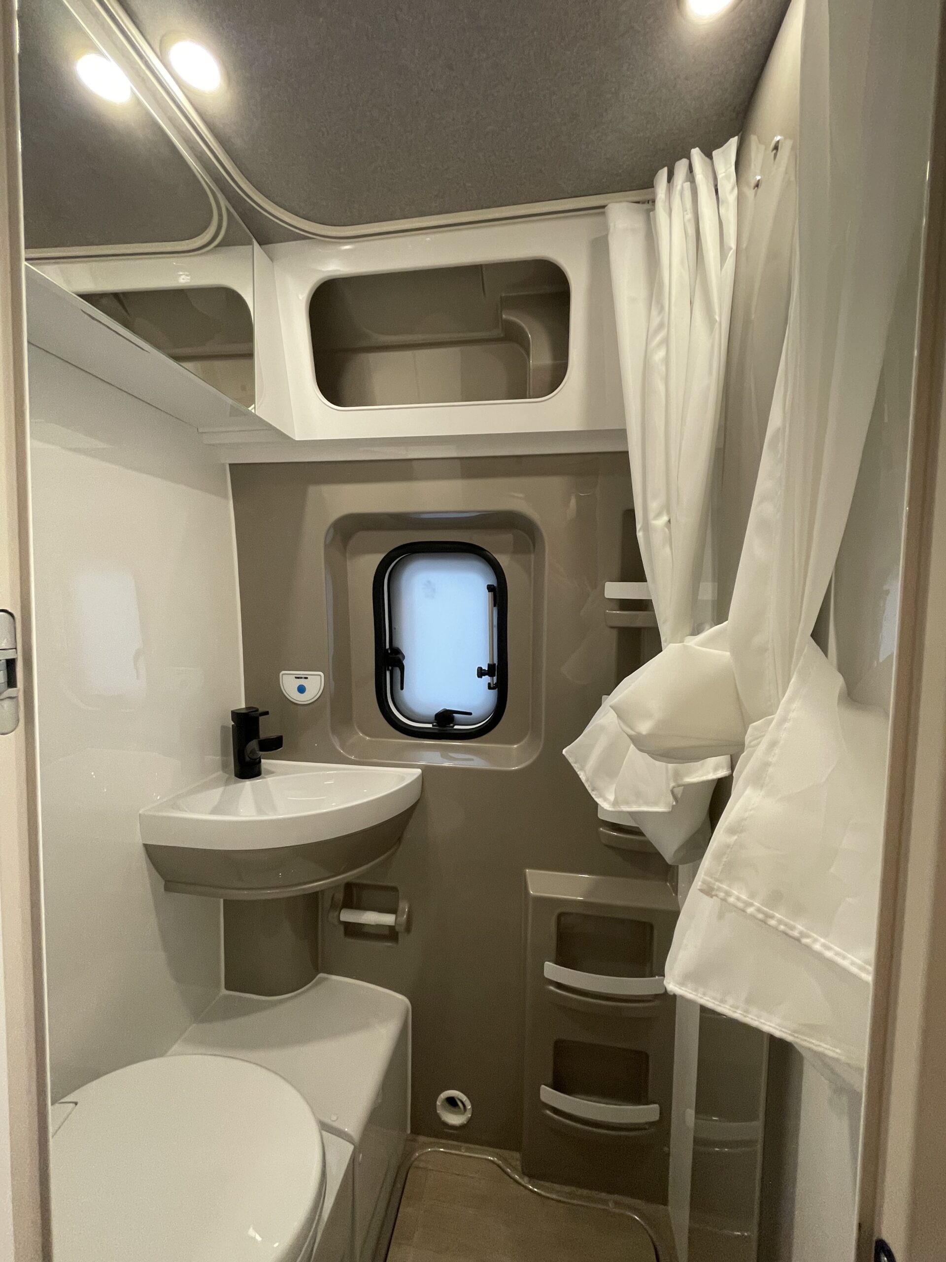 • Cuarto de aseo compacto con ducha integrada, inodoro giratorio Thetford y ducha extraíble